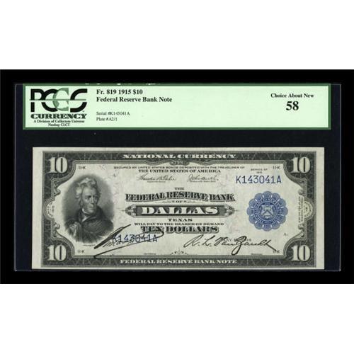 <B>Fr. 819 $10 1915 Federal Reserve Bank Note PCGS Choice About New 58.</B></I> This is perhaps the finest graded example for this tougher Dallas issue. PCGS has not yet published population reports but a quick look at PMG records shows no graded notes above VF. Bright colors deliver excellent eye appeal.<BR><BR><b>Shipping:</b> Coins & Currency (<a target="_blank" href="http://www.heritageauctions.com/common/shipping.php">view shipping information</a>)