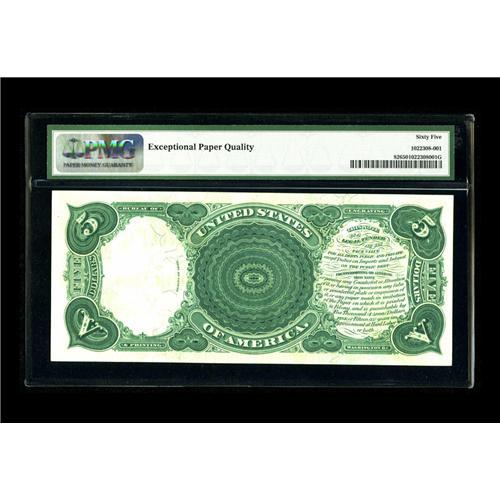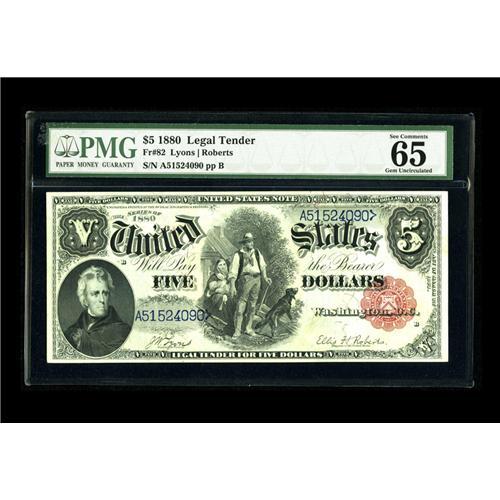 <B>Fr. 82 $5 1880 Legal Tender PMG Gem Uncirculated 65 EPQ.</B></I> We previously handled this note and had this to say: "Broadly margined, with easily seen heavy original embossing throughout the surface of the note. The colors are terrific, as is the eye appeal. Fr. 82 is a much scarcer number, with a census under 50, as opposed to its type mate, Fr. 80, with a census figure well over 200."<BR><BR><b>Shipping:</b> Coin/Currency (<a target="_blank" href="http://www.heritageauctions.com/common/shipping.php">view shipping information</a>)