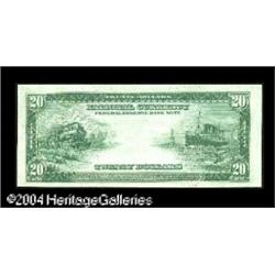 Fr. 824 $20 1915 Federal Reserve Bank Note Superb Gem N <B>Fr. 824 $20 1915 Federal Reserve Bank Note Superb Gem New.</B></I> In all our sales, we have described only four $20 Federal Reserve Bank Notes as Superb. The first was eleven years ago, and the second was the Scheuerman note in January 2001. This note, from the Trask Collection, originates from the same small group of uncirculated notes as the Scheuerman piece. It's new to the census, as it has been off the market for over five decades. The note has all its original embossing, not only of the serial numbers but throughout the design. The margins are broad and even, the centering is exceptional and the colors are perfect. It clearly numbers in the top few Twenty Dollar Federal Reserve Bank Notes in terms of ultimate quality. The Scheuerman example realized slightly in excess of its $10,000 estimate, and this incredible piece should do as well or better.<BR><I>From the collection of Malcolm A. Trask.</B></I> <BR><BR><B>Important notice:</B> Heritage usually auctions material at the rate of 200-250 lots per hour. On some occasions eBay Live bid software or the Internet may not be able to keep up with the pace of the auction. We recommend placing a realistic absentee bid now as insurance to avoid disappointment. Occasionally the auctioneer may eliminate or reject an eBay Live bid, and the auctioneer may also reopen a lot after the close of the eBay live bidding (usually because we missed an audience bid), and may reject your bid even if it shows you as the winning bidder. By bidding via eBay Live, you agree that Heritage may award the lot to another bidder at its sole discretion under the circumstances described above or any other reasonable circumstances. Since eBay bids are not shown to us until we open the lot on the floor, we treat those bids just like floor bids. In most cases the floor responds before the eBay bid is presented to us, due to Internet lag time, so for consistency we have made it a policy that floor bids are always considered first over tie eBay live bids. Also please note that all Heritage lots purchased through eBay Live carry a 20% Buyer's Premium. Please make sure you read the Terms and Conditions before you bid. This lot is being auctioned in conjunction with a live floor auction by Heritage Galleries & Auctioneers. All final auction and invoice information will be supplied by Heritage Galleries & Auctioneers, and all other information should be considered preliminary. Lot:17655