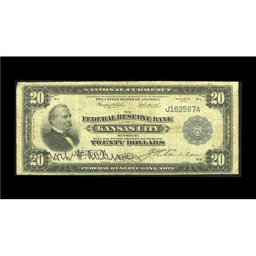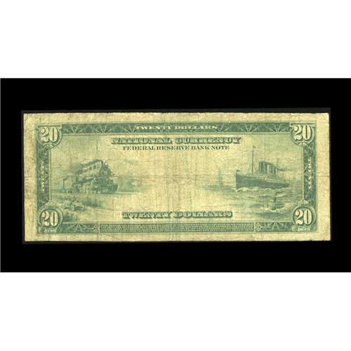 <B>Fr. 826 $20 1915 Federal Reserve Bank Note Very Good-Fine.</B></I> A truly scarce number with fewer than two dozen known in all grades combined. This one has seen heavy use and circulation, but is free from the marks, tears, and other problems associated with the grade.