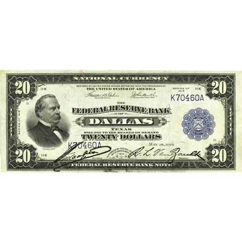 <B>Fr. 828 $20 1915 Federal Reserve Bank Note Extremely Fine.</B></I> This is a new note for the census from this scarce Friedberg number. Three folds are noticed on this example along with black ink at bottom center of both sides. Due to the texture and appearance of the ink, it is believed to have come from the printing of the signatures of district officials Hoopes and Van Zandt.<BR><I>From The Plymouth Rock Collection</B></I>