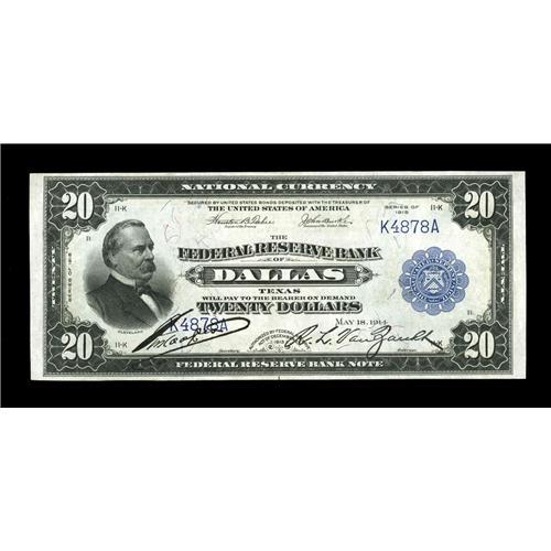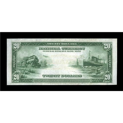 <B>Fr. 828 $20 1915 Federal Reserve Bank Note Very Choice New.</B></I> This was previously the Amon Carter note, and our consignor indicates he obtained it from the Jim Thompson sale. The note is the only uncirculated piece listed of the approximately two dozen known examples. It is broadly margined, with lovely fresh paper surfaces and ideal color. A note which will certainly bring a solid price and could easily surprise with a runaway price.