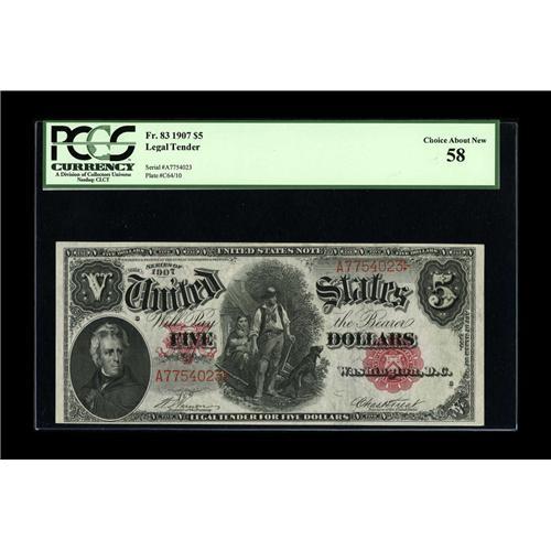 <B>Fr. 83 $5 1907 Legal Tender PCGS Choice About New 58.</B></I> We are unaware as to why this bright, originally embossed note did not receive a PPQ modifier. This is one of the tougher 1907 Woodchoppers with only about 75 examples known.<BR><I>From The Bill and Kathy Stella Currency Collection</B></I><BR><BR><b>Shipping:</b> Coin/Currency (<a target="_blank" href="http://www.heritageauctions.com/common/shipping.php">view shipping information</a>)