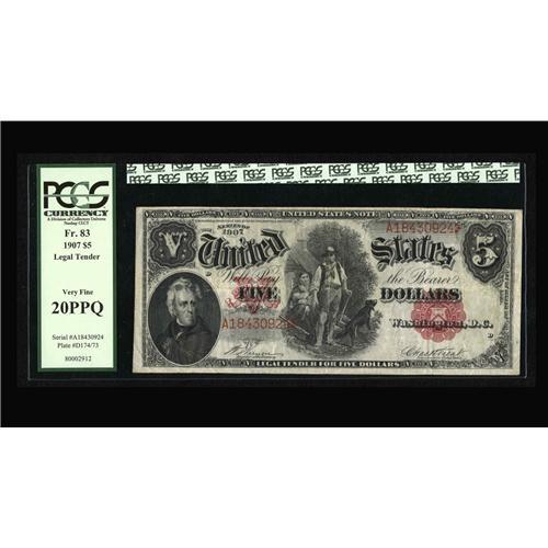 Fr. 83 $5 1907 Legal Tender PCGS Very Fine 20PPQ. Fr. 83 $5 1907 Legal Tender PCGS Very Fine 20PPQ.