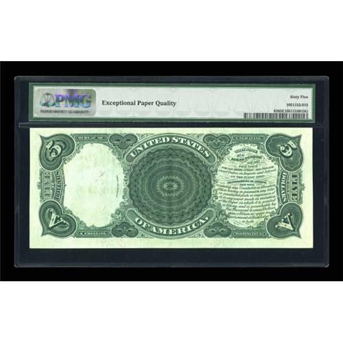<B>Fr. 83 $5 1907 Legal Tender PMG Gem Uncirculated 65 EPQ.</B></I> 120 examples of Fr. 83 are known, but not a whole lot of them are nicer than this full Gem EPQ example. The colors are strong and the surfaces strictly original. PMG has graded 22 pieces - three at this level and three higher.<BR><I>From The Dr. Edward & Joanne Dauer Collection</B></I><BR><BR><b>Shipping:</b> Coins & Currency (<a target="_blank" href="http://www.heritageauctions.com/common/shipping.php">view shipping information</a>)