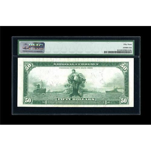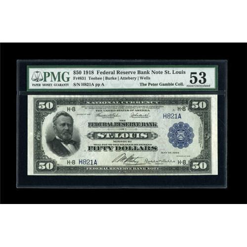 <B>Fr. 831 $50 1918 Federal Reserve Bank Note PMG About Uncirculated 53.</B></I> This is not a really rare note in terms of numbers known, with a few over fifty pieces enumerated, but about a dozen are permanently impounded and the remaining thirty-odd pieces are held closely by collectors. This is a one-number major type. The St. Louis district was the only district for which Fifties were printed, and this Teehee-Burke, Attebery-Wells signature combination was the only one employed. The note is broadly margined with excellent color and terrific eye appeal. It certainly has the look of a fully Uncirculated note, but there is without doubt a minor fold somewhere as this note has been called AU in all its auction appearances dating back to the early 1990s. In its last trip to the auction block, the note realized just a drop over $25,000. <BR><I>From The Peter Gamble Collection.</B></I><BR><BR><b>Shipping:</b> Coins & Currency (<a target="_blank" href="http://www.heritageauctions.com/common/shipping.php">view shipping information</a>)