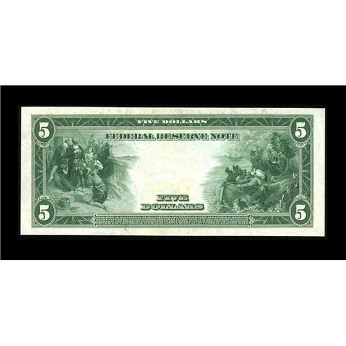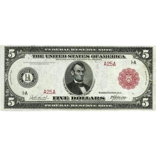 <B>Fr. 832a $5 1914 Red Seal Federal Reserve Note Gem New.</B></I> This Boston Red Seal $5 with serial number A25A is blessed with natural paper ripple and embossing.<BR><I>From The Plymouth Rock Collection</B></I>