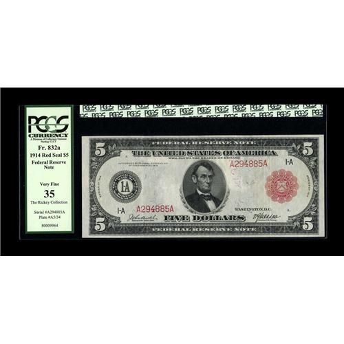 <B>Fr. 832a $5 1914 Red Seal Federal Reserve Note PCGS Very Fine 35.</B></I> The paper remains bright on this example that is close to the higher grade.<BR><BR><b>Shipping:</b> Coin/Currency (<a target="_blank" href="http://www.heritageauctions.com/common/shipping.php">view shipping information</a>)