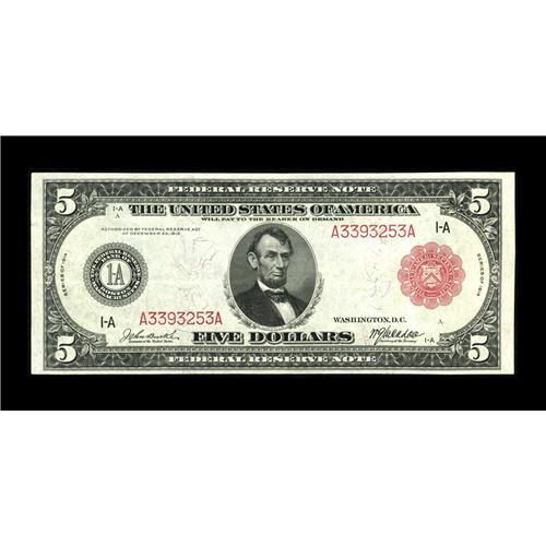 <B>Fr. 832b $5 1914 Red Seal Federal Reserve Note Very Fine-Extremely Fine.</B></I> The eye appeal is great on this Boston Red Seal that looks and feels natural.<BR><I>From The Bill and Kathy Stella Currency Collection</B></I><BR><BR><b>Shipping:</b> Coin/Currency (<a target="_blank" href="http://www.heritageauctions.com/common/shipping.php">view shipping information</a>)
