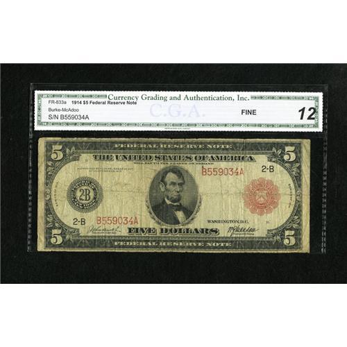 <B>Fr. 833a $5 1914 Red Seal Federal Reserve Note CGA Fine 12.</B></I> Red Seals still remain quite popular and this note will be no exception.<BR><BR><b>Shipping:</b> Coins & Currency (<a target="_blank" href="http://www.heritageauctions.com/common/shipping.php">view shipping information</a>)