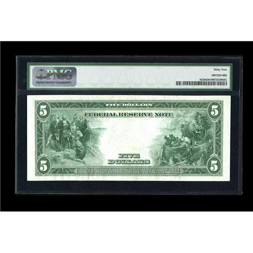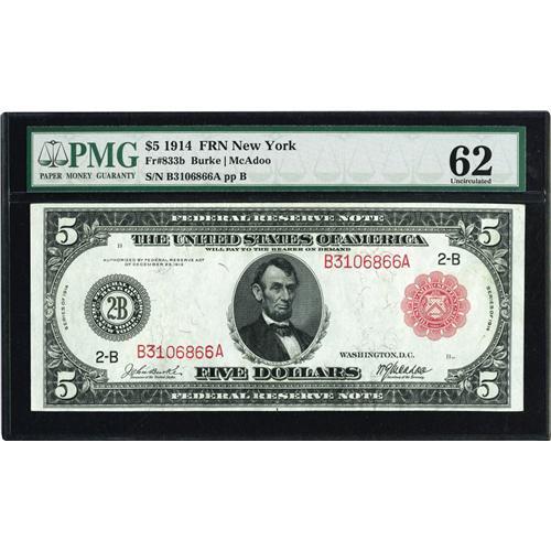 <B>Fr. 833a $5 1914 Red Seal Federal Reserve Note PMG Uncirculated 62.</B></I> A new note for the census which has remained hidden for quite some time. Very nicely margined with great color and terrific eye appeal. Noted on the holder as an 833b, but is actually an 833a known because it is missing the district number and letter designator above the plate letter at left.
