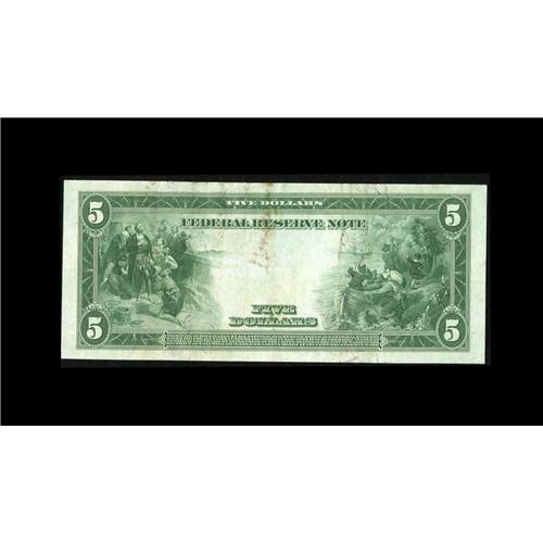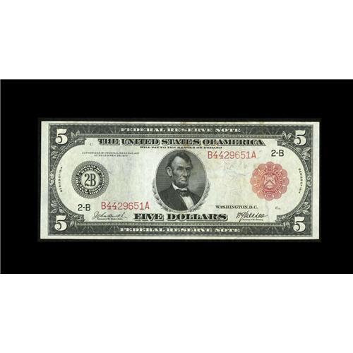 <B>Fr. 833a $5 1914 Red Seal Federal Reserve Note Very Fine-Extremely Fine.</B></I> Though Extremely Fine to About New from the standpoint of actual grade, this otherwise very nice Red Seal Five has a fair amount of staining.<BR><I>From The Plymouth Rock Collection</B></I>