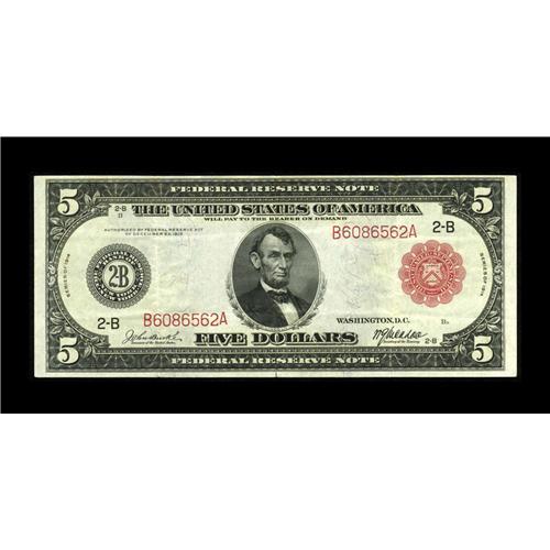<B>Fr. 833b $5 1914 Red Seal Federal Reserve Note Very Fine-Extremely Fine.</B></I> The most common of the Red Seal Fives, which makes it an ideal note with which to represent the type. The surfaces are crisp and the colors very bright.<BR><I>From The Bill and Kathy Stella Currency Collection</B></I><BR><BR><b>Shipping:</b> Coin/Currency (<a target="_blank" href="http://www.heritageauctions.com/common/shipping.php">view shipping information</a>)