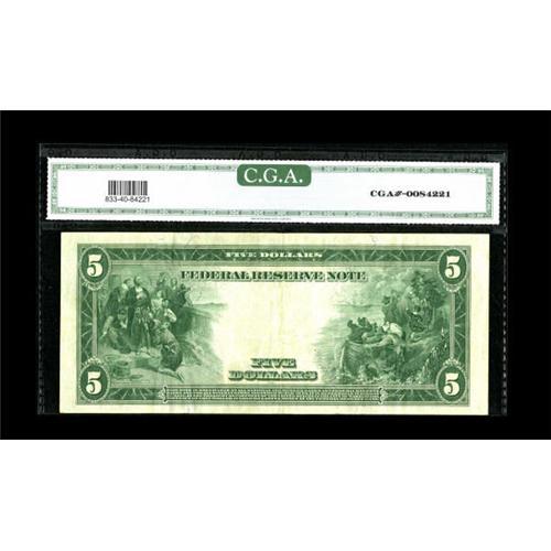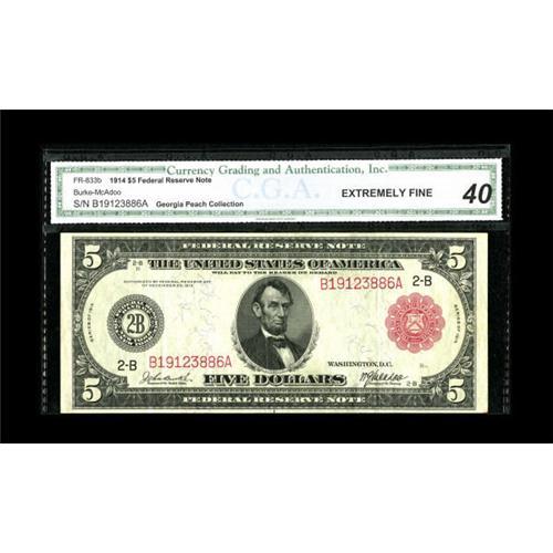 <B>Fr. 833b $5 1914 Red Seal Federal Reserve Note CGA Extremely Fine 40.</B></I> This $5 Red Seal has bright paper, dark inks, and embossing. <BR><BR><b>Shipping:</b> Coins & Currency (<a target="_blank" href="http://www.heritageauctions.com/common/shipping.php">view shipping information</a>)