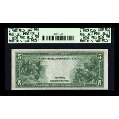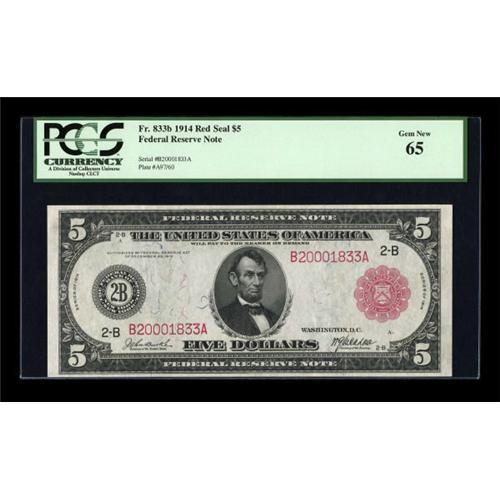<B>Fr. 833b $5 1914 Red Seal Federal Reserve Note PCGS Gem New 65.</B></I> The margins and colors are terrific on this New York District Red Seal Five Dollar Fed. This is the most common Red Seal Five, making it an ideal piece with which to represent the type.<BR><BR><b>Shipping:</b> Coins & Currency (<a target="_blank" href="http://www.heritageauctions.com/common/shipping.php">view shipping information</a>)