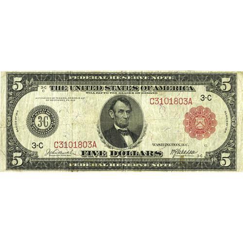 <B>Fr. 834b $5 1914 Red Seal Federal Reserve Note Fine.</B></I> This average circulated note remains bright with healthy edges and paper for the grade.