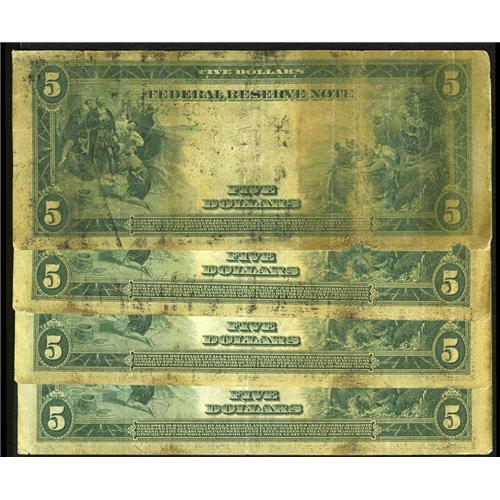 <B>Fr. 835b $5 1914 Red Seal Federal Reserve Notes Cut Sheet of Four Very Good.</B></I> Here is what could quite possibly be the only cut sheet of Cleveland Red Seals known. Poor storage has marred the surfaces of these notes with staining and aging, but they are together and possibly unique as such. A neat item for the FRN specialist. This lot may not be returned for any reason.