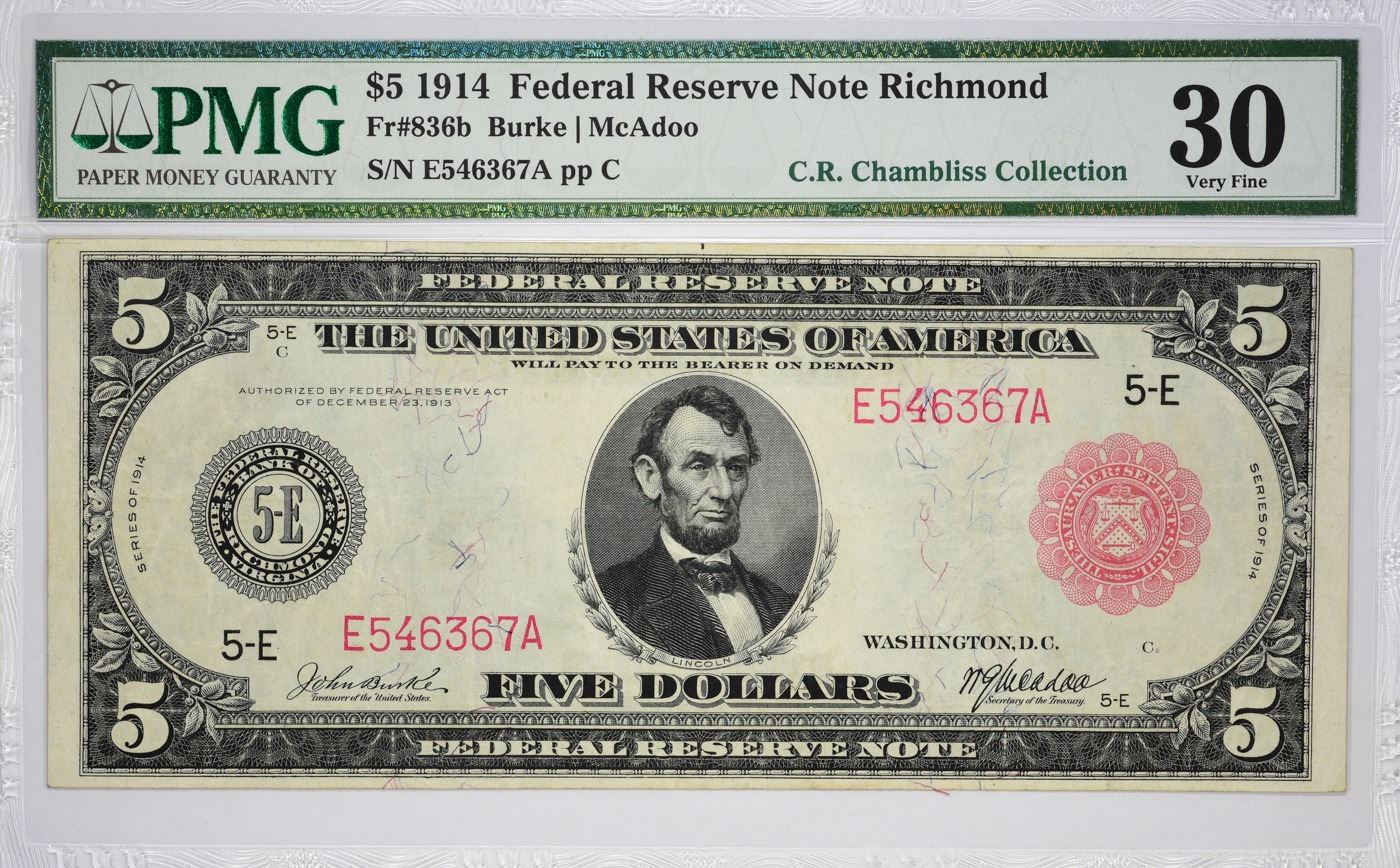 Fr. 836b. 1914 $5 Federal Reserve Note. Red Seal. Richmond. PMG Very Fine 30. A scarce Richmond type b note that is one of only 49 pieces recorded in the Track & Price census. This pleasing mid-grade offering shows appeal that rivals a finer grade and retains some original embossing.