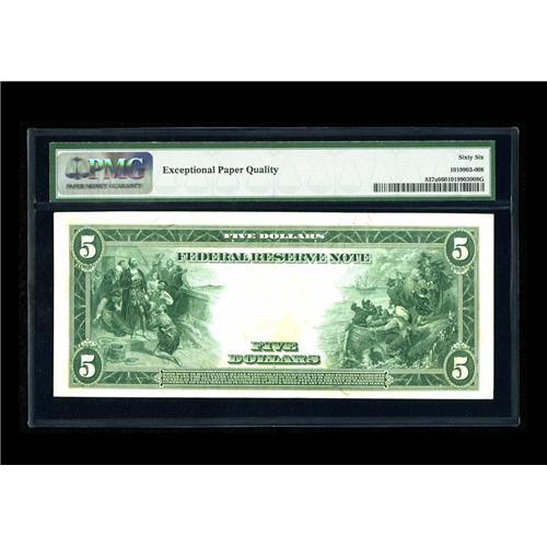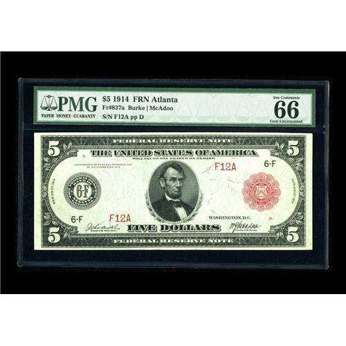 <B>Fr. 837a $5 1914 Red Seal Federal Reserve Note PMG Gem Uncirculated 66 EPQ.</B></I> This beauty has been off the market for over a decade. Currently only 21 Atlanta Type A Red Seals are known in all grades. In addition to perhaps being the finest known of that small group, it also bears the lowest serial number recorded, F12A. Our estimate for this rarity may well prove conservative in the extreme.<BR><I>From The Bill and Kathy Stella Currency Collection</B></I><BR><BR><b>Shipping:</b> Coin/Currency (<a target="_blank" href="http://www.heritageauctions.com/common/shipping.php">view shipping information</a>)