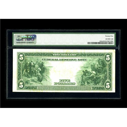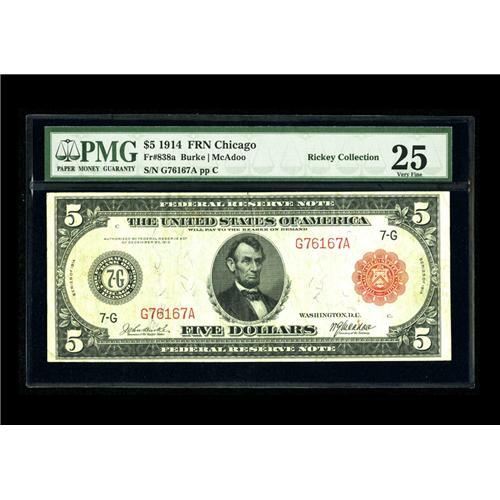 <B>Fr. 838a $5 1914 Red Seal Federal Reserve Note PMG Very Fine 25.</B></I> We are pleased to offer this attractive Red Seal with the Radar serial number G76167A. The seal is still especially bright and the paper void of problems. <BR><I>Ex: Rickey Collection</B></I><BR><BR><b>Shipping:</b> Coin/Currency (<a target="_blank" href="http://www.heritageauctions.com/common/shipping.php">view shipping information</a>)