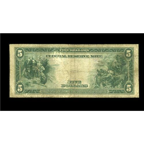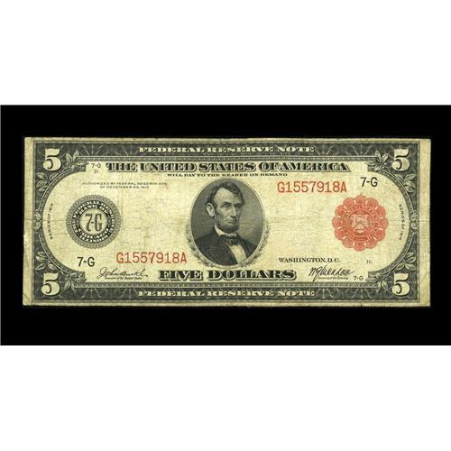 <B>Fr. 838b $5 1914 Red Seal Federal Reserve Note Fine.</B></I> This scarce Red Seal Five from Chicago is particularly nice looking for its grade and is free from pinholes or other embarrassments to detract from its appeal. The population of this number is only in the mid 20's, so a considerable wait might be expected before another example in any condition is again available.