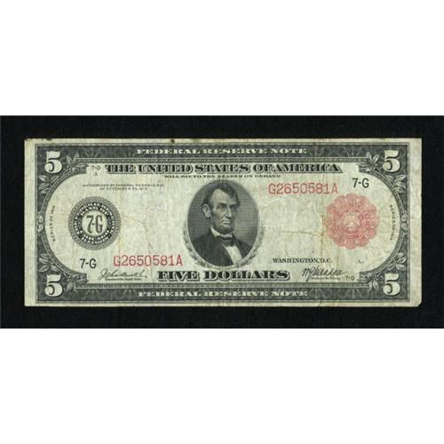 <B>Fr. 838b $5 1914 Red Seal Federal Reserve Note Fine.</B></I> This $5 Red Seal is still snappy and overall bright. The red third printing shows some fading.<BR><BR><b>Shipping:</b> Coins & Currency (<a target="_blank" href="http://www.heritageauctions.com/common/shipping.php">view shipping information</a>)