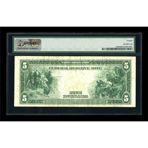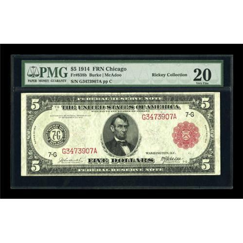 <B>Fr. 838b $5 1914 Red Seal Federal Reserve Note PMG Very Fine 20.</B></I> Some crispness still remains on this Chicago note.<BR><BR><b>Shipping:</b> Coins & Currency (<a target="_blank" href="http://www.heritageauctions.com/common/shipping.php">view shipping information</a>)