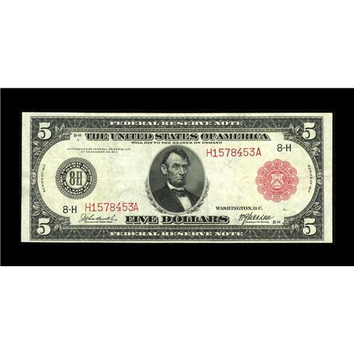 <B>Fr. 839a $5 1914 Red Seal Federal Reserve Note Very Fine-Extremely Fine.</B></I> This example is among the nicest of its type we have to offer this evening It is new to the census and retains plenty of snap. The sharp print contrasts well against the bright paper. A note worthy of your consideration.<BR><I>From The Bill and Kathy Stella Currency Collection</B></I><BR><BR><b>Shipping:</b> Coin/Currency (<a target="_blank" href="http://www.heritageauctions.com/common/shipping.php">view shipping information</a>)