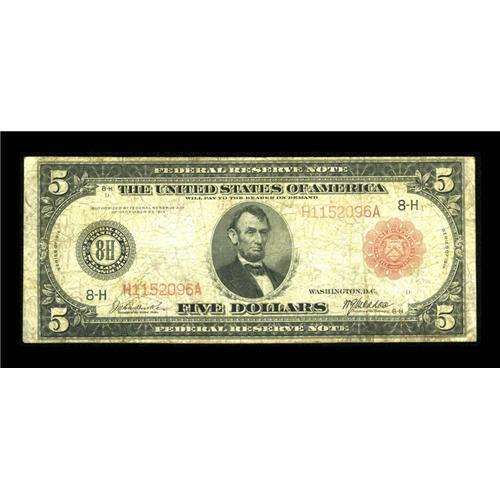 <B>Fr. 839b $5 1914 Red Seal Federal Reserve Note Very Good.</B></I> This is a scarce note on St. Louis. Low grade Red Seal FRNs are the rule, not the exception.<BR><BR><b>Shipping:</b> Coins & Currency (<a target="_blank" href="http://www.heritageauctions.com/common/shipping.php">view shipping information</a>)