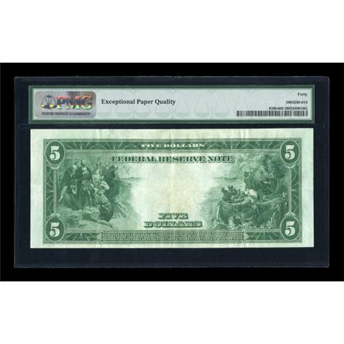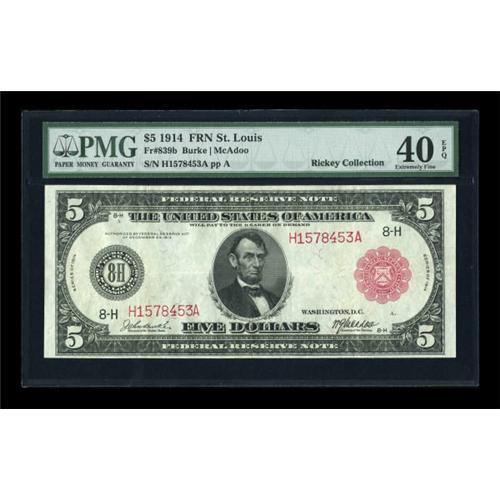 <B>Fr. 839b $5 1914 Red Seal Federal Reserve Note PMG Extremely Fine 40 EPQ.</B></I> The surfaces are quite bright and the embossing pronounced on this lovely St. Louis Red Seal. PMG has graded 32 Fr. 839b notes to date, and only two have graded higher than this example, with the best an AU 50 lacking the EPQ designation. <BR><BR><b>Shipping:</b> Coins & Currency (<a target="_blank" href="http://www.heritageauctions.com/common/shipping.php">view shipping information</a>)