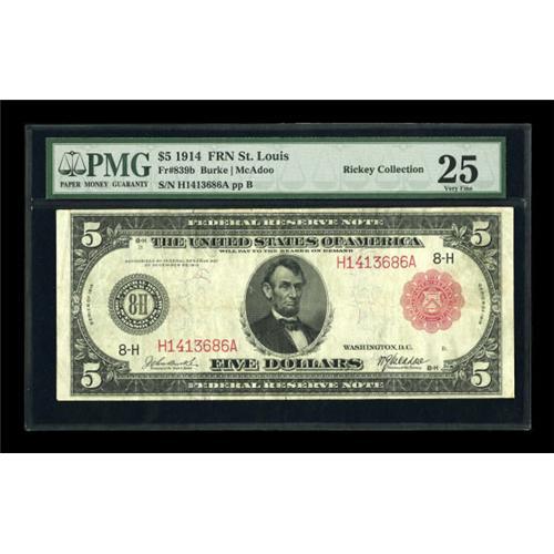 <B>Fr. 839b $5 1914 Red Seal Federal Reserve Note PMG Very Fine 25.</B></I> This is a pleasing lightly circulated note from St. Louis.<BR><BR><b>Shipping:</b> Coins & Currency (<a target="_blank" href="http://www.heritageauctions.com/common/shipping.php">view shipping information</a>)