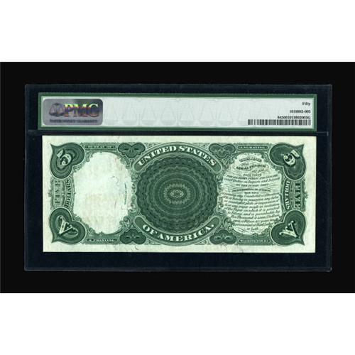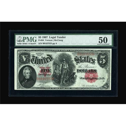 <B>Fr. 84 $5 1907 Legal Tender PMG About Uncirculated 50.</B></I> A light bend in the center accounts for the grade on this wavy and pleasing issue.<BR><BR><b>Shipping:</b> Coins & Currency (<a target="_blank" href="http://www.heritageauctions.com/common/shipping.php">view shipping information</a>)