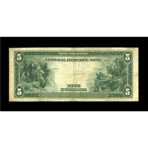<B>Fr. 840b $5 1914 Red Seal Federal Reserve Note Fine.</B></I> A large percentage of known notes fall in this grade range for this district. Some minor distractions such as pinholes near the district seal and a bit of adhesive at upper right are noticed.<BR><I>From The Bill and Kathy Stella Currency Collection</B></I><BR><BR><b>Shipping:</b> Coin/Currency (<a target="_blank" href="http://www.heritageauctions.com/common/shipping.php">view shipping information</a>)