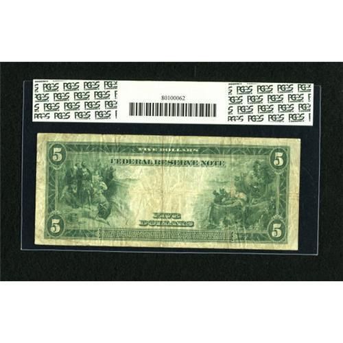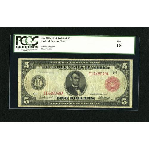 <B>Fr. 840b $5 1914 Red Seal Federal Reserve Note PCGS Fine 15.</B></I> An attractive and original Red Seal that retains almost all of its original color. Only about forty examples of this Minneapolis issue have been reported to the census takers.<BR><BR><b>Shipping:</b> Coins & Currency (<a target="_blank" href="http://www.heritageauctions.com/common/shipping.php">view shipping information</a>)