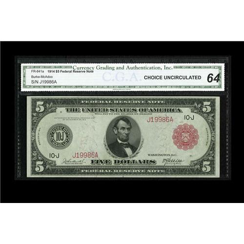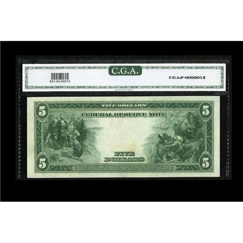 <B>Fr. 841a $5 1914 Red Seal Federal Reserve Note CGA Choice Uncirculated 64.</B></I> A scarce note of which very few even reach this lofty grade level. Nice margins are seen on bright white surfaces.
