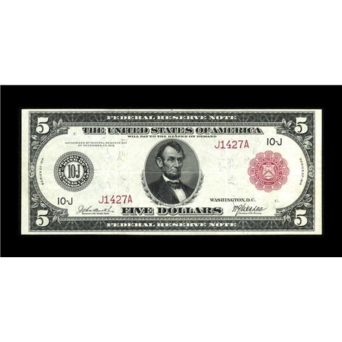 <B>Fr. 841a $5 1914 Red Seal Federal Reserve Note Very Fine-Extremely Fine.</B></I> A perfectly natural note with plenty of embossing present. The colors are bright and sharp on this crisp Red Seal for the tougher Kansas City district.<BR><I>From The Bill and Kathy Stella Currency Collection</B></I><BR><BR><b>Shipping:</b> Coin/Currency (<a target="_blank" href="http://www.heritageauctions.com/common/shipping.php">view shipping information</a>)