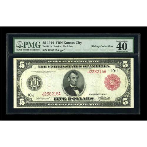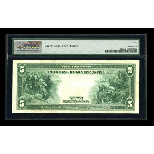 <B>Fr. 841a $5 1914 Red Seal Federal Reserve Note PMG Extremely Fine 40.</B></I> About thirty examples are known with this specimen one of the nicer ones. Pleasing deep color and large margins are noticed<BR><BR><b>Shipping:</b> Coins & Currency (<a target="_blank" href="http://www.heritageauctions.com/common/shipping.php">view shipping information</a>)