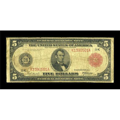 <B>Fr. 842b $5 1914 Red Seal Federal Reserve Note Good-Very Good.</B></I> This is a new entrant for census takers that has been well circulated.<BR><BR><b>Shipping:</b> Coins & Currency (<a target="_blank" href="http://www.heritageauctions.com/common/shipping.php">view shipping information</a>)