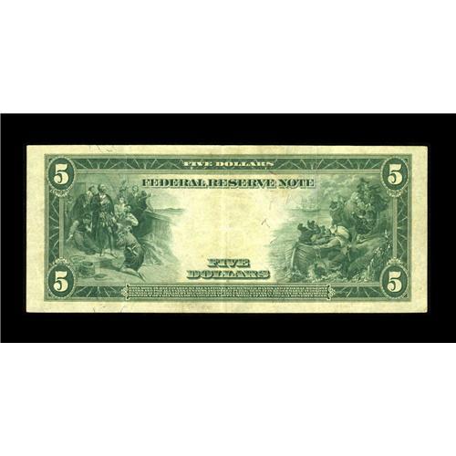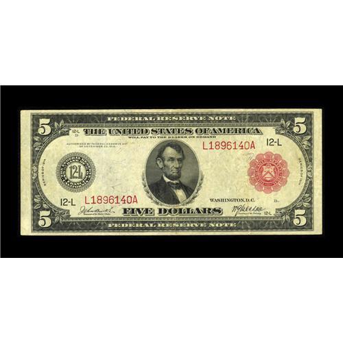 <B>Fr. 843b $5 1914 Red Seal Federal Reserve Note Very Fine-Extremely Fine.</B></I> This is another example which is unreported in the census. Wide side margins encase this example well. Despite the nominal wear, the colors remain bright.<BR><I>From The Bill and Kathy Stella Currency Collection</B></I><BR><BR><b>Shipping:</b> Coin/Currency (<a target="_blank" href="http://www.heritageauctions.com/common/shipping.php">view shipping information</a>)
