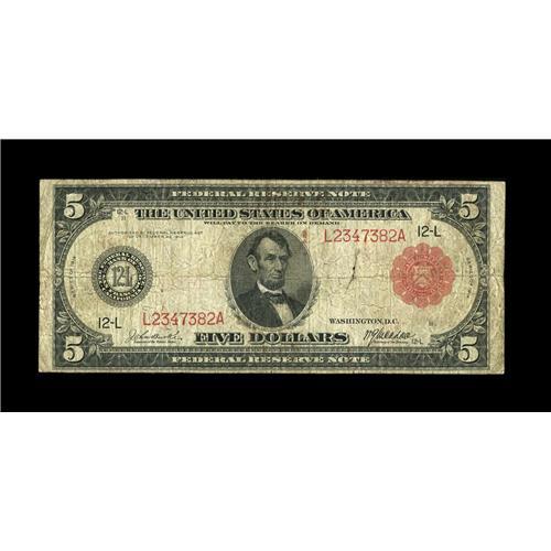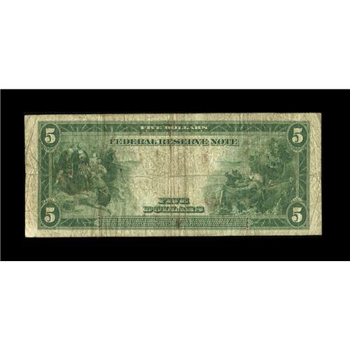<B>Fr. 843b $5 1914 Red Seal Federal Reserve Note Very Good.</B></I> An internal tear is noticed to the right of Lincoln's portrait. This example is a new addition to the census and certainly to be welcomed.<BR><BR><b>Shipping:</b> Coin/Currency (<a target="_blank" href="http://www.heritageauctions.com/common/shipping.php">view shipping information</a>)