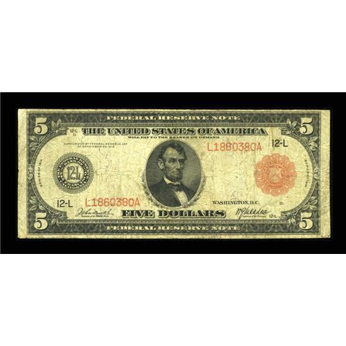 <B>Fr. 843b $5 1914 Red Seal Federal Reserve Note Very Good.</B></I> This is a well circulated $5 San Fran Red Seal that has been able to retain some snap to its paper.<BR><BR><b>Shipping:</b> Coins & Currency (<a target="_blank" href="http://www.heritageauctions.com/common/shipping.php">view shipping information</a>)