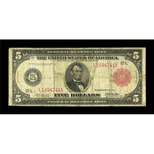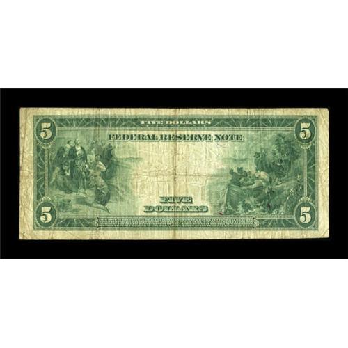 <B>Fr. 843b $5 1914 Red Seal Federal Reserve Note Fine.</B></I> This note retains great color for its level of circulation. To date, fewer than three dozen examples of this number are known to collectors.<BR><BR><b>Shipping:</b> Coins & Currency (<a target="_blank" href="http://www.heritageauctions.com/common/shipping.php">view shipping information</a>)