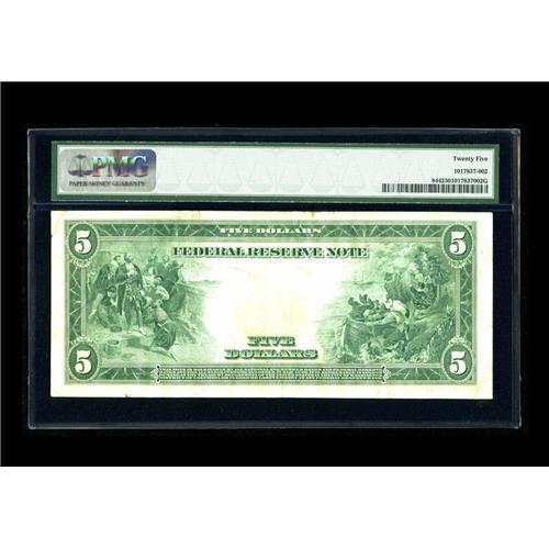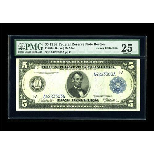 <B>Fr. 844 $5 1914 Federal Reserve Note PCGS Very Fine 25.</B></I> To date only about three dozen examples of this issue have been reported, but only nine have made auction appearances. This is a picture perfect VF that would be an ideal representation of the grade in a grading set. <BR><I>Ex: Rickey Collection</B></I><BR><BR><b>Shipping:</b> Coin/Currency (<a target="_blank" href="http://www.heritageauctions.com/common/shipping.php">view shipping information</a>)