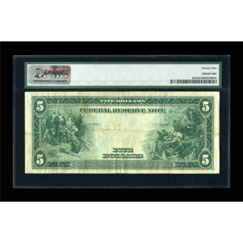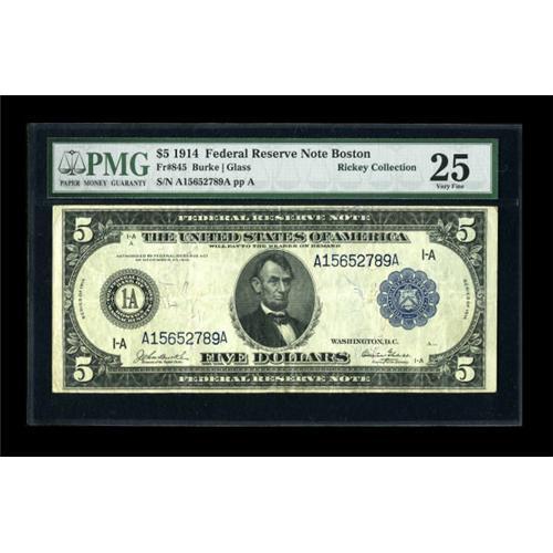<B>Fr. 845 $5 1914 Federal Reserve Note PMG Very Fine 25.</B></I> About forty examples are known for this Boston issue that carries the Burke/Glass signature combination.<BR><BR><b>Shipping:</b> Coins & Currency (<a target="_blank" href="http://www.heritageauctions.com/common/shipping.php">view shipping information</a>)