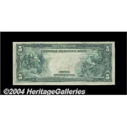 Fr. 846 $5 1914 Federal Reserve Note Extremely Fine. A fairly scarce number. <BR><BR><B>Important notice:</B> Heritage usually auctions material at the rate of 200-250 lots per hour. On some occasions eBay Live bid software or the Internet may not be able to keep up with the pace of the auction. We recommend placing a realistic absentee bid now as insurance to avoid disappointment. Occasionally the auctioneer may eliminate or reject an eBay Live bid, and the auctioneer may also reopen a lot after the close of the eBay live bidding (usually because we missed an audience bid), and may reject your bid even if it shows you as the winning bidder. By bidding via eBay Live, you agree that Heritage may award the lot to another bidder at its sole discretion under the circumstances described above or any other reasonable circumstances. Since eBay bids are not shown to us until we open the lot on the floor, we treat those bids just like floor bids. In most cases the floor responds before the eBay bid is presented to us, due to Internet lag time, so for consistency we have made it a policy that floor bids are always considered first over tie eBay live bids. Also please note that all Heritage lots purchased through eBay Live carry a 20% Buyer's Premium. Please make sure you read the Terms and Conditions before you bid. <BR><BR><B>IMPORTANT ANNOUNCEMENT ABOUT RESERVES:</B> Heritage now divulges all reserves on its web site 7 days before every auction. If you want to know whether the reserve on this lot has been met, and if not, what the reserve amount is, please visit this lot page on the HeritageCoin.com web site, or email: bid@HeritageGalleries.com