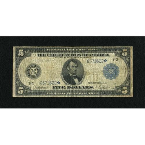 <B>Fr. 870 $5 1914 Federal Reserve Star Note Good-Very Good.</B></I> There are around only 50 serial numbers in the census for this Friedberg number. An internal split is noticed in the portrait area.<BR><BR><b>Shipping:</b> Coins & Currency (<a target="_blank" href="http://www.heritageauctions.com/common/shipping.php">view shipping information</a>)