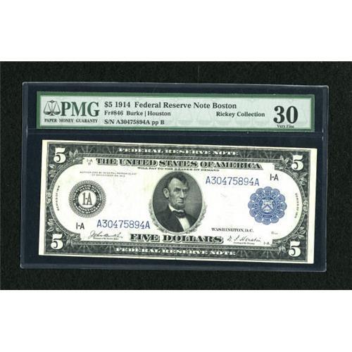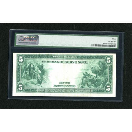 <B>Fr. 846 $5 1914 Federal Reserve Note PMG Very Fine 30.</B></I> Bright paper and a pleasing overprint are seen on this $5.<BR><BR><b>Shipping:</b> Coins & Currency (<a target="_blank" href="http://www.heritageauctions.com/common/shipping.php">view shipping information</a>)