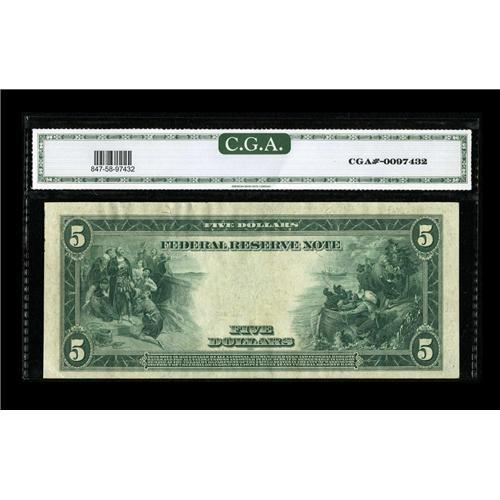 <B>Fr. 847a $5 1914 Federal Reserve Note CGA About Uncirculated 58.</B></I> A couple of faint bends are noted in the holder and the paper appears original.