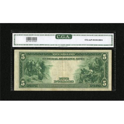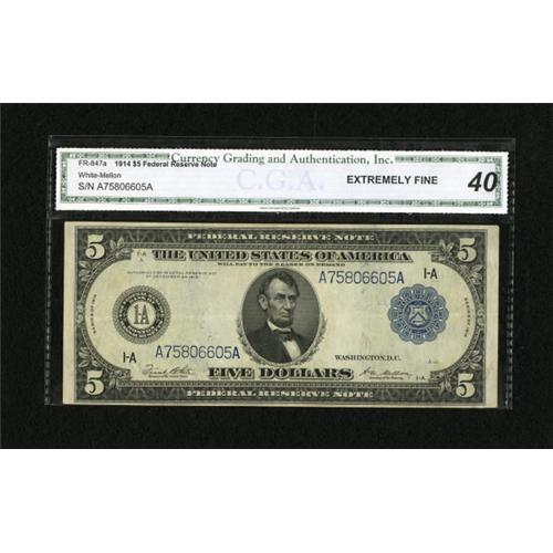 <B>Fr. 847a $5 1914 Federal Reserve Note CGA Extremely Fine 40.</B></I> A decent piece with solid margins and a deep third printing.<BR><BR><b>Shipping:</b> Coins & Currency (<a target="_blank" href="http://www.heritageauctions.com/common/shipping.php">view shipping information</a>)