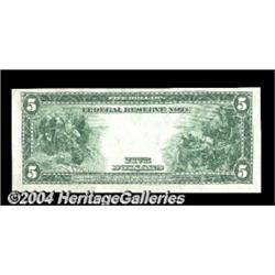 Fr. 847a $5 1914 Federal Reserve Note Choice New. Nicely margined, with good paper surfaces and perfect color. <BR><BR><B>Important notice:</B> Heritage usually auctions material at the rate of 200-250 lots per hour. On some occasions eBay Live bid software or the Internet may not be able to keep up with the pace of the auction. We recommend placing a realistic absentee bid now as insurance to avoid disappointment. Occasionally the auctioneer may eliminate or reject an eBay Live bid, and the auctioneer may also reopen a lot after the close of the eBay live bidding (usually because we missed an audience bid), and may reject your bid even if it shows you as the winning bidder. By bidding via eBay Live, you agree that Heritage may award the lot to another bidder at its sole discretion under the circumstances described above or any other reasonable circumstances. Since eBay bids are not shown to us until we open the lot on the floor, we treat those bids just like floor bids. In most cases the floor responds before the eBay bid is presented to us, due to Internet lag time, so for consistency we have made it a policy that floor bids are always considered first over tie eBay live bids. Also please note that all Heritage lots purchased through eBay Live carry a 20% Buyer's Premium. Please make sure you read the Terms and Conditions before you bid. <BR><BR><B>IMPORTANT ANNOUNCEMENT ABOUT RESERVES:</B> Heritage now divulges all reserves on its web site 7 days before every auction. If you want to know whether the reserve on this lot has been met, and if not, what the reserve amount is, please visit this lot page on the HeritageCoin.com web site, or email: bid@HeritageGalleries.com